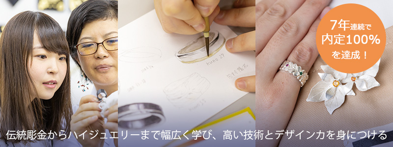 ジュエリーデザイン科3年生全員が、学んだことを生かした専門職で内定を獲得! 7年連続で就職内定100%となりました。 <内定状況> 株式会社ケイ・ウノ/クラフトマン 株式会社GSTV/クラフトマン 株式会社杢目金屋/コンシェルジュ 株式会社杢目金屋/クラフトマン 有限会社アベジュエリー/クラフトマン(2名) 株式会社スーパーギルド/クラフトマン 株式会社ナガホリ/クラフトマン 株式会社桑山/総合職 株式会社エクミス/リモデルプランナー