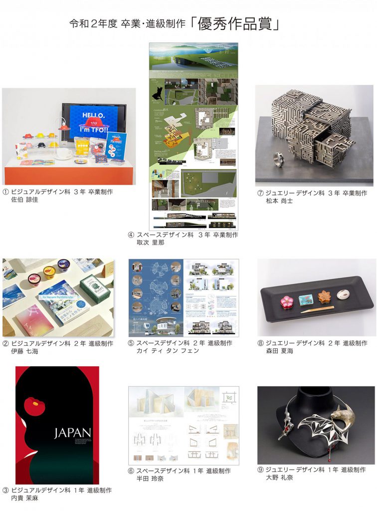 3/5(金)から5日間に渡り開催された、卒業・進級制作展。1・2年生は1年間の学習の成果としての進級制作、3年生は3年間の集大成となる卒業制作を、本校山脇ギャラリーにて展示しました。 今年は、コロナウイルス感染症予防の観点から校内の人数を制限するため、WEBによる事前予約制にて開催させていただきました。ご来場いただいた皆さまには、ご来場、並びに、作品投票やアンケートにもご協力いただき、誠にありがとうございました。 講師による審査によって各科・学年から最も優秀な作品を制作した学生に贈られる『優秀作品賞』、来場者の方の投票により、最多投票を獲得した作品に贈られる「来場者特別賞」が決定しましたので、お知らせいたします。 また、ご来場いただいた皆さまからの感想の一部をご紹介いたします。 「卒業・進級制作の優秀作品賞」受賞者一覧(各学科ごと、上から順に) ①ビジュアルデザイン科 3年 卒業制作 3年間で学んできた知識や技能の集大成として、各自研究テーマを定め、企画・制作・展示をする。 受賞者:佐伯 諒佳 受賞作品:「TFO」ギフト用紅茶のブランディング ②ビジュアルデザイン科 2年 進級制作 Webポートフォリオサイトとイメージボードの制作。就職ツールとして完成度の高い、自己ブランディングを意識したものを制作する。 受賞者:伊藤 七海 受賞作品:「Ito Nanami portfolio site.」 ③ビジュアルデザイン科 1年 進級制作 海外を巡回する日本をテーマにした企画展を想定し、外国人がみてもわかりやすく、また日本への期待が高まるものを制作する。 受賞者:内貴 茉麻 受賞作品:「日本」をテーマにしたポスター(使用ソフトIllustrator) ④スペースデザイン科 3年 卒業制作 3年間で学んだことの集大成として、建築や店舗など自らが企画・計画した建物の設計デザインを行い、模型・プレゼンテーションボードをつくる。 受賞者:取次 里那 受賞作品:「湖畔のシゴトバ 彩霞-saika-」 ⑤スペースデザイン科 2年 進級制作 2年次で学んだことの集大成として、住宅や店舗など自らが企画・計画した建物の設計デザインを行い、模型・プレゼンテーションボードをつくる。 受賞者:カイ ティ タン フェン 受賞作品:「我々の美術館」 建築デザイン ⑥スペースデザイン科 1年 進級制作 学校の中庭の広さの敷地に、自分の暮らし方を考えた住宅の設計デザインを行い、模型・プレゼンテーションボードをつくる。 受賞者:半田 玲奈 受賞作品:「新しいデザインが生まれる家」住宅デザイン ⑦ジュエリーデザイン科 3年 卒業制作 3年間の集大成としての作品を制作する。 受賞者:松本 尚士 受賞作品:「カラクリ箱」 リング リングケース ⑧ジュエリーデザイン科 2年 進級制作 2年間で学んだ技術を活かし、美しく完成度の高いジュエリーを集大成として制作する。 受賞者:森田 夏海 受賞作品:「心地よいひと時を」 ブローチ ⑨ジュエリーデザイン科 1年 進級制作 1年間で学んだ技術を活かし、彫り留めを入れたジュエリーを集大成として制作する。 受賞者:大野 礼奈 受賞作品:「Immortal」 チョーカー 卒業・進級制作展「優秀作品賞」「来場者特別賞」決定 「卒業・進級制作の来場者特別賞」受賞者一覧(各学科ごと、左から順に) ①ビジュアルデザイン科 3年 卒業制作 受賞者:井須 琴巳 受賞作品:「Fivee」 配色の手助けができる5色絵の具セットの商品企画 ②スペースデザイン科 3年 卒業制作 受賞者:西 歩由莉 受賞作品:「Hotel Andersen」 店舗計画(模型、ボード A1×3枚) ③ジュエリーデザイン科 3年 卒業制作。 受賞者:松本 尚士 受賞作品:「カラクリ箱」 リング リングケース ◆ 来場者様からの感想 ◆ ・予約制で混雑がなかったのでコロナ禍でも安心できました。広々と展示されていて見やすかったです。 ・スペースが広くとられていたので作品を近くで見たり遠くから見たりと様々な視点から楽しめました。 ・さすが、デザインの学校らしい魅せる展示の仕方ですごく良かったです。 ・コロナ禍の中あたたまる作品みて、未来を感じました。ありがとうございました。 ・3年生の卒業作品がどれも凄いものばかりで自分も是非やってみたいと強く感じました。 ・下級生から順に見て行くと、最後に卒業制作の大作に出会え、ワクワクしました。 ・コロナ禍で思うように授業ができない中で、1年生も素晴らしい作品ばかりで、びっくりしました。