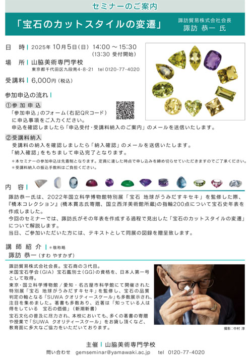 10月5日(日)、宝飾業界の第一人者・諏訪 恭一氏によるセミナー「宝石のカットスタイルの変遷」を開催します。