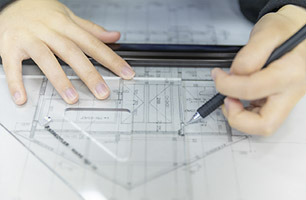 スペースデザイン科は、製図用の道具を使って住宅図面を描く体験ができる「手描きの図面を描いてみよう」。
