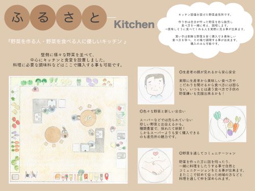 公益社団法人インテリア産業協会が主催する『令和元年度 キッチン空間アイデアコンテスト』に、スペースデザイン科1年生が「インテリアデザインA」の授業課題として取組み応募。根本愛菜さんが奨励賞を受賞しました。 ◆募集テーマ「団らん・優しいキッチン空間」 【奨励賞】スペースデザイン科1年生 作品タイトル「ふるさとキッチン」 キッチン設備を設けた野菜直売所。野菜を作る人、野菜を食べる人に優しいキッチンをデザイン。