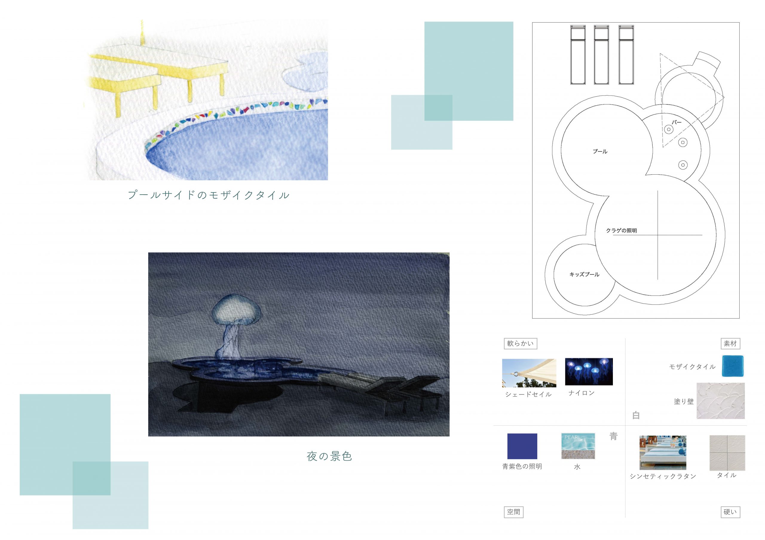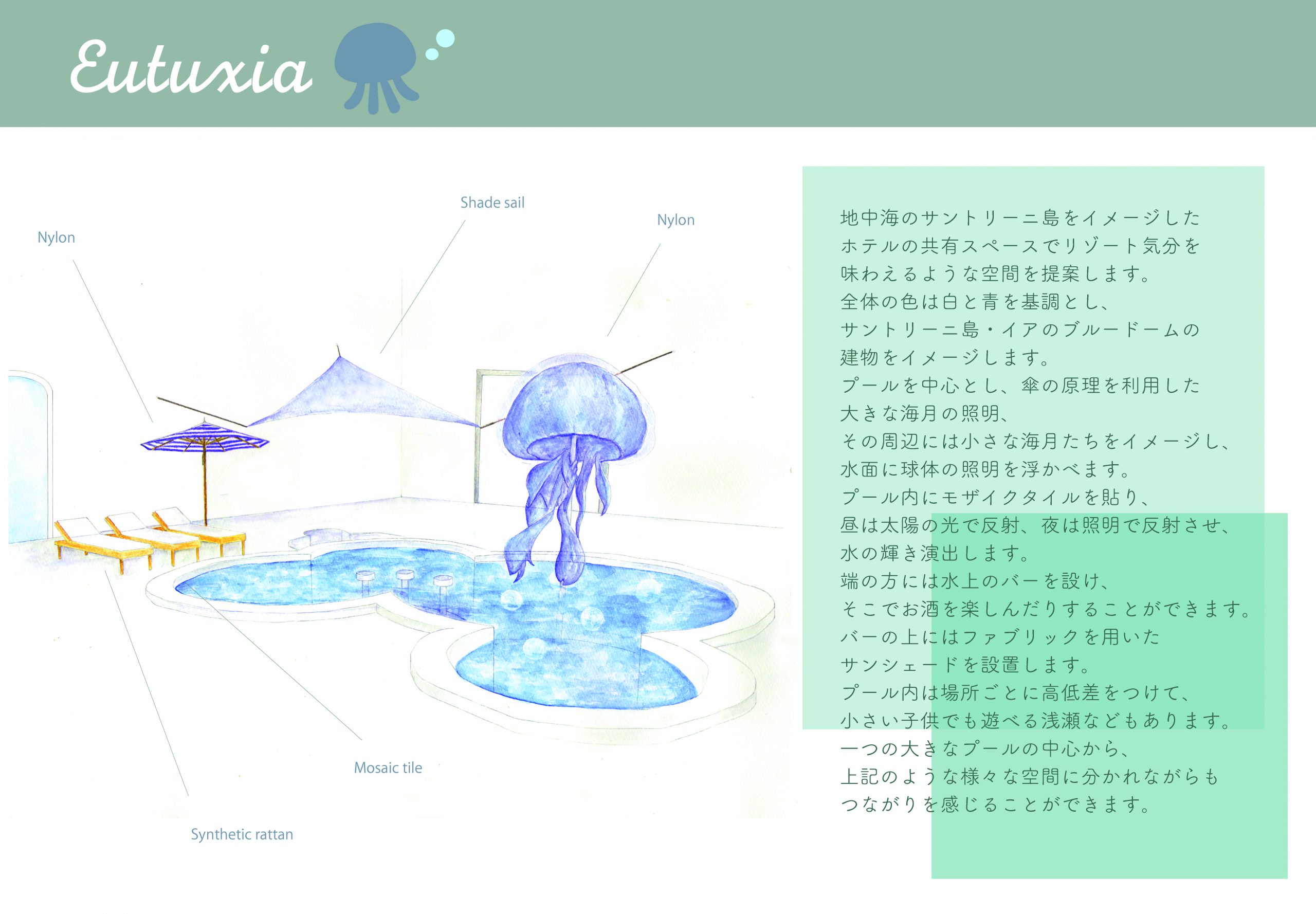 一般社団法人日本インテリアファブリックス協会が主催する、『第17回インテリアデザインコンペ2020』に、スペースデザイン科2年生が「PC表現」の授業課題として、グループワークで取組み、応募しました。「人とつながるゲストハウス」という課題テーマに沿って、地中海のサントリーニ島をイメージしてデザインした作品「Eutuxia」が入選しました。 ▼コンテスト審査結果 https://japantex.jp/?p=10030 作品タイトル「Eutuxia」 スペースデザイン科2年生 カイ ティ タン フェン、井上 結依、根本 愛菜