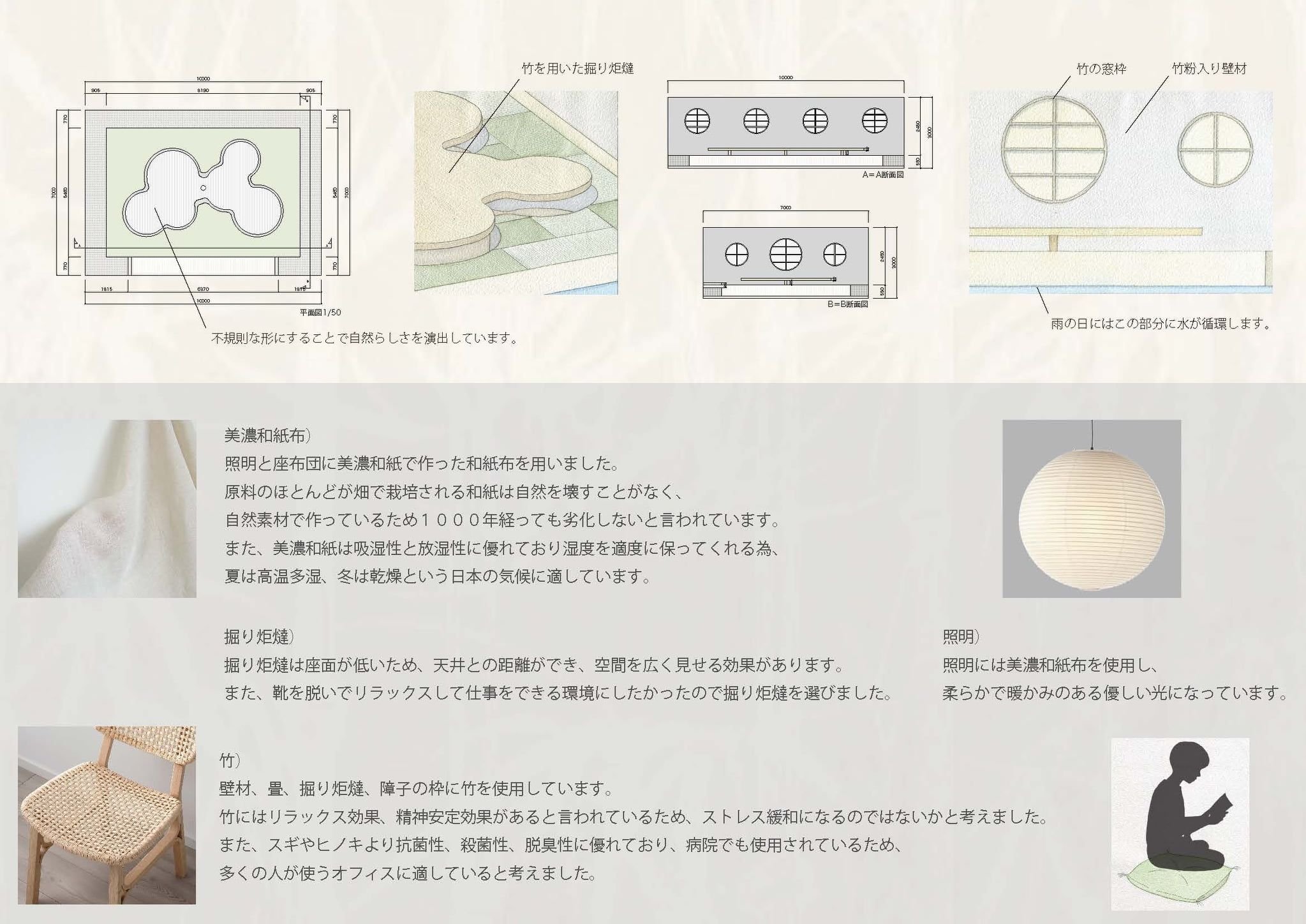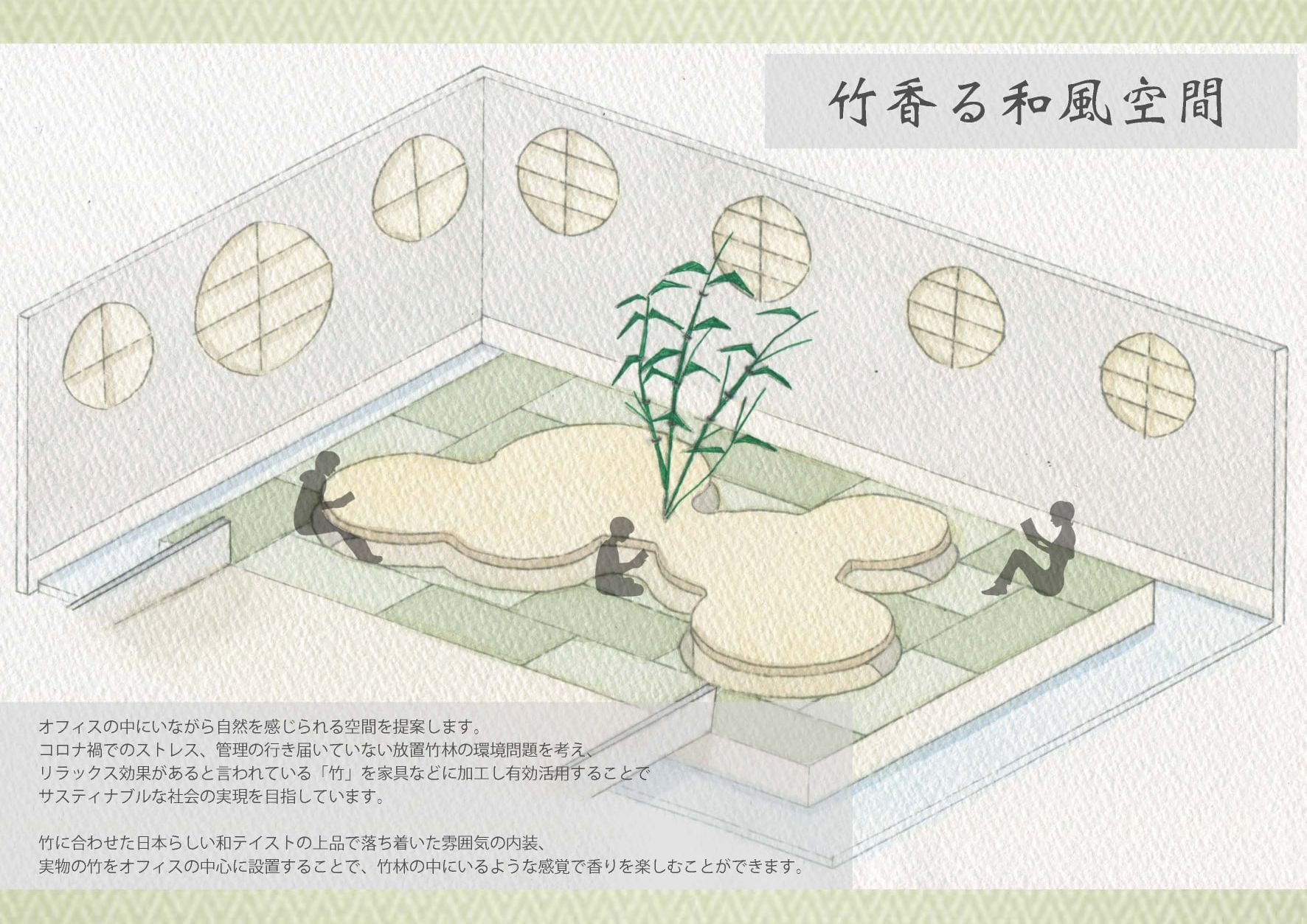一般社団法人日本インテリアファブリックス協会が主催する、『第18回インテリアデザインコンペ2021』に、スペースデザイン科2年生が「PC表現」の授業課題として、グループワークで取組み、応募しました。 「インテリアファブリックスで造る無限の可能性」をテーマに、オフィスの中にいながら自然を感じられる空間を提案した作品「竹香る和風空間 OTAKE」が見事入選しました! 作品タイトル「竹香る和風空間 OTAKE」 スペースデザイン科2年生 藤井 里奈、江原 沙也花、渡邉 未衣愛